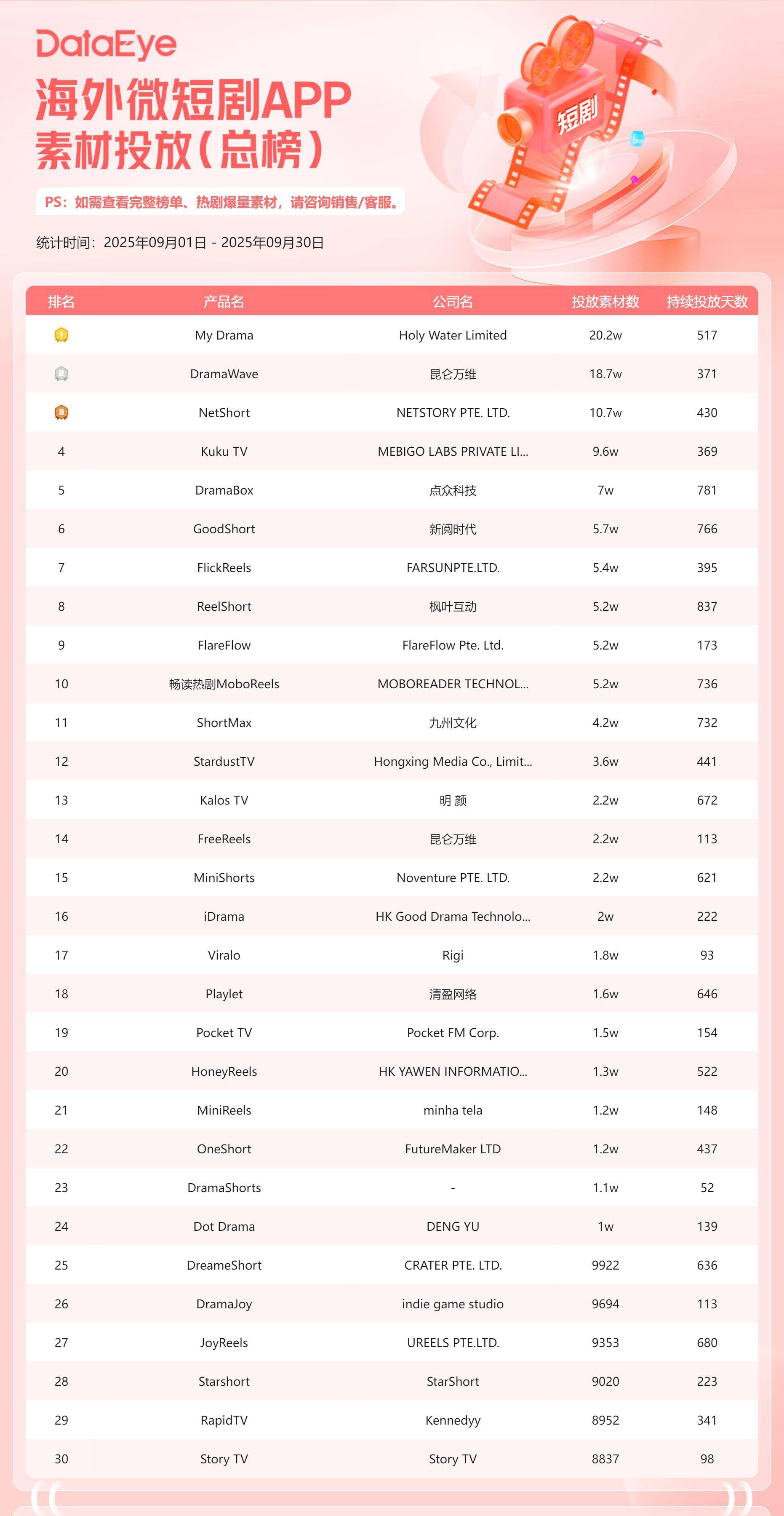 9月海外微短剧APP素材投放榜中,My Drama和DramaWave投放素材数稳居TOP2,NetShort跃居第三。