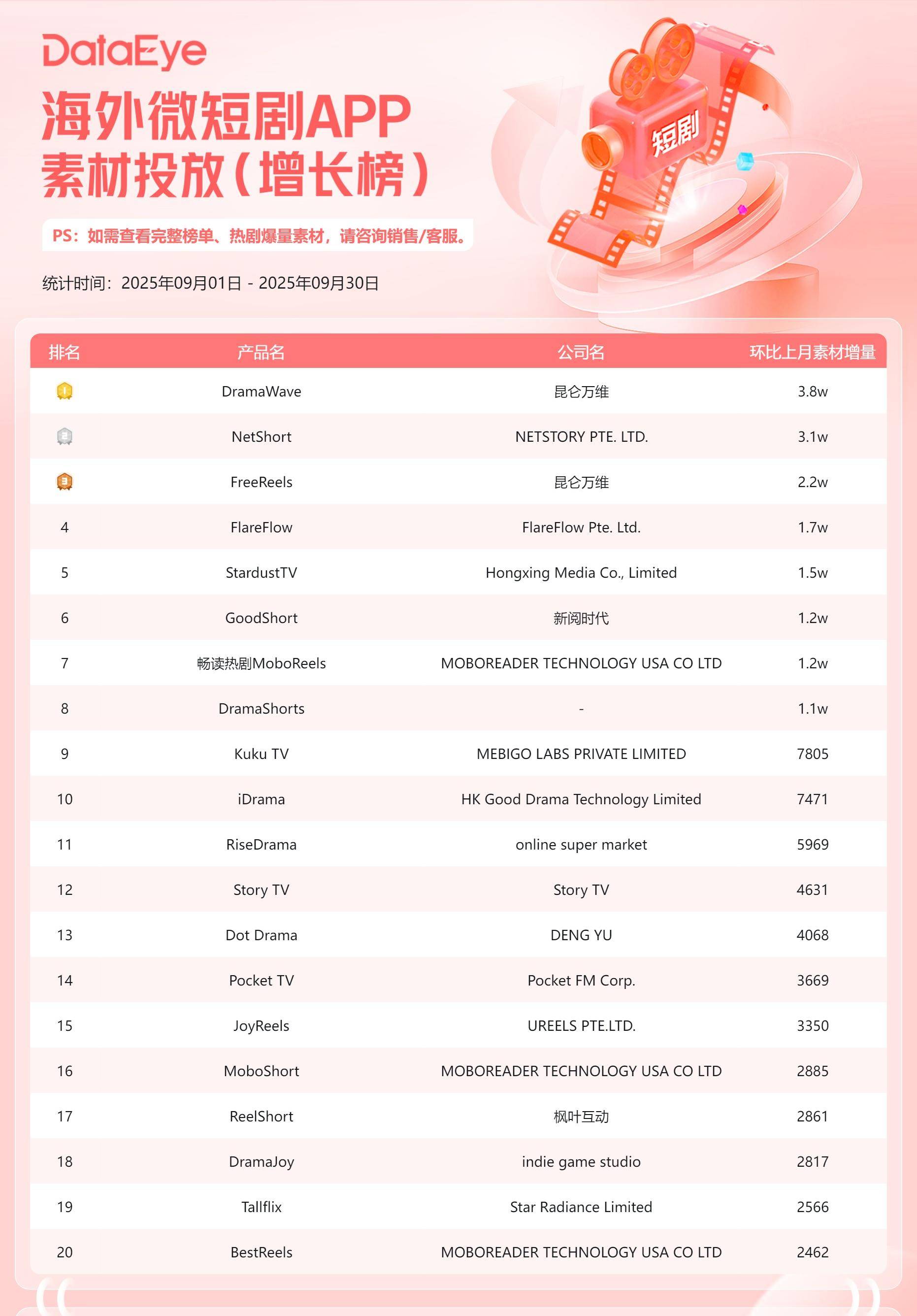 (六)海外微短剧APP素材投放榜:总榜与增长榜