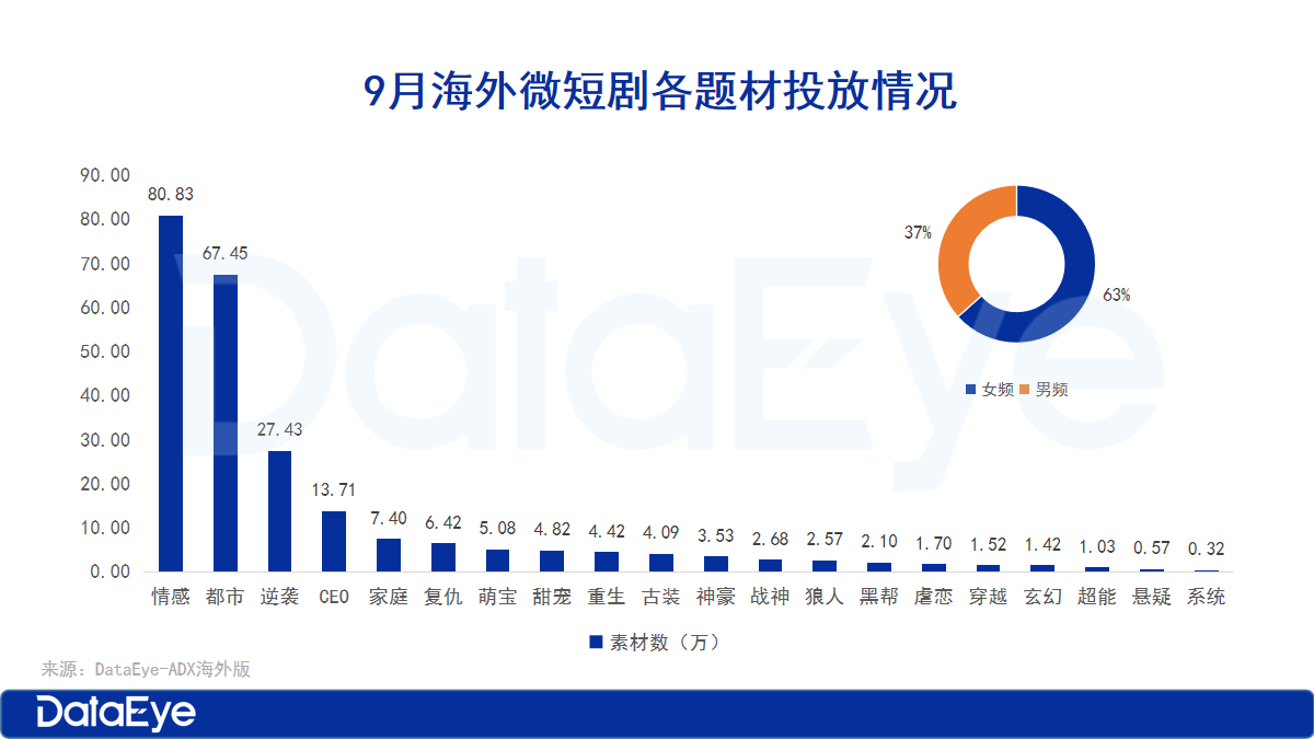 DataEye-ADX海外短剧版数据显示,9月海外微短剧热投题材中,女频素材投放量占比达63%。男频素材投放量占比达37%,均与上期持平。