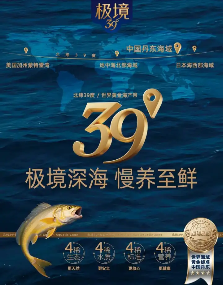 “极境39°”的品牌命名,承接品牌顶层战略思考。中交丹东海发将大黄鱼优质鱼种的养殖版图战略性拓展至北黄海——北纬39°黄金生长带的丹东海域。这条与世界顶级渔场日本海西部海域、旧金山蒙特雷湾、地中海北部海域同纬度的全球公认的黄金水产带,拥有独特水域环境以及黄金水域指标。地中海的金枪,加州的鲍,北海道的胆,丹东的大黄鱼。“极境39°”不仅是地理位置的链接,更是品质与标准的对标。它向消费者宣告:丹东海域并非区域特产,而是与世界顶级产区共享同一片天赐的海洋牧场,其产品生而具备“世界海域,黄金标准”的基因。