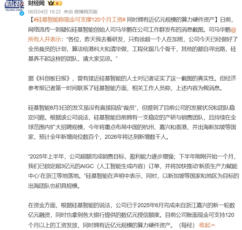 今年8月,硅基智能因为一张内部群聊截图被传出“裁员”的消息,不过公司很快便辟谣;硅基智能表示,公司拥有一支稳定的产研与销售团队,且持续在全球范围内扩大招聘规模。2025年,将重点布局杭州、嘉兴、香港、新加坡等地,预计全年新增岗位数百个,2026年将达到新增数千人的扩张节奏。
