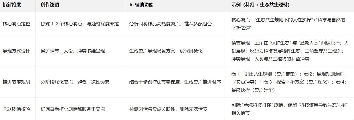 - 第四步(逻辑闭环):跨章节校验,确保卖点、因果、解决逻辑全程自洽。