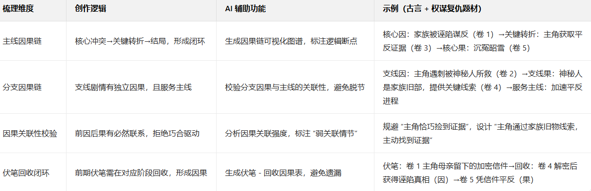 - 第二步(因果链梳理):工具补充因果:“主角发现密码因:修复时注意到墨迹异常(卷 1)→找到解密钥匙因:古籍夹层藏有祖传玉佩(卷 2)→解密成功因:玉佩与密码纹路匹配(卷 3)→揭秘真相因:破解密码获得反派罪证(卷 4)”,形成闭环;