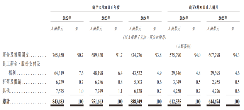 2022-2024年、2025H1,公司销售及营销开支分别为8.44亿元、7.52亿元、8.89亿元和6.45亿元,销售费用率高达50.6%、40.7%、40.2%和38.3%;其中,广告及推广开支占销售费用的90%以上。