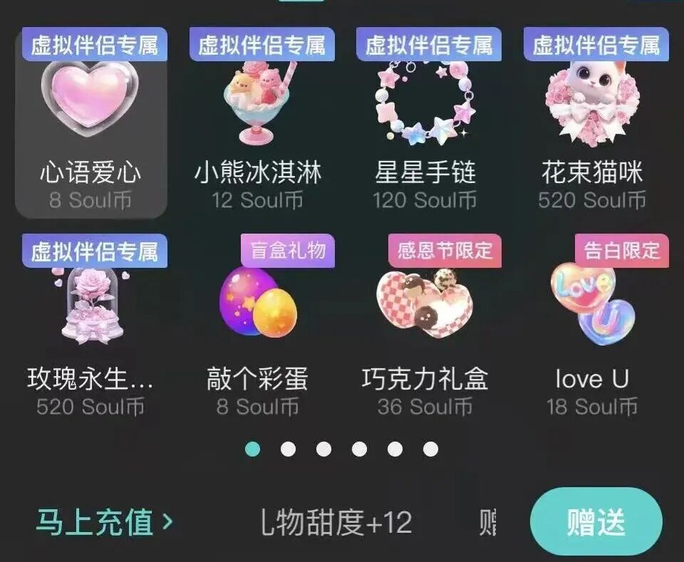 用户与“屿你”“小桃兔兔”日常对话可以增加“甜度”,想要额外再加甜度需要送付费礼物,礼物价格在8Soul币到520Soul币不等(1元=5Soul币);此外想要增加与虚拟伴侣的语音通话时长也需要付费,10分钟通话需要12Soul币。