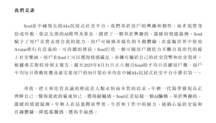 值得注意的是,与前几年不同的是,Soul最新招股书的核心叙事从“元宇宙社交”转向了AI驱动的“情绪陪伴”。