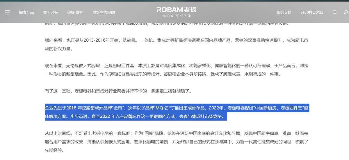 其实在产品力方面,老板电器一直都很能打。这一点,从其在集成灶品类市场的后来者居上就不难看出来。