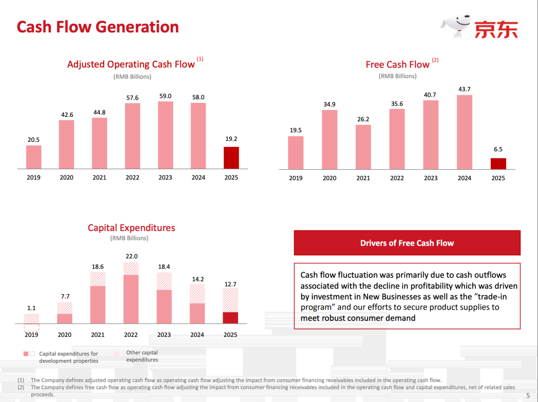 从行业角度来看,京东用极高的代价,将外卖行业从“双寡头”带入“三方竞争”的市场。站在商业角度上,外卖业务的投入更让京东损失惨重——2025年,京东自由现金流从437亿元缩水至65亿元,暴跌85%。