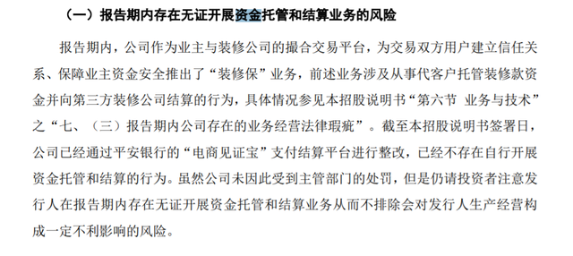 更值得关注的还有资金合规问题。据悉,土巴兔的招股书表明有6.575亿元设在装修保存管账户中的无证经营支付款项,而这个款项来自于2012年推出的“装修保”业务。