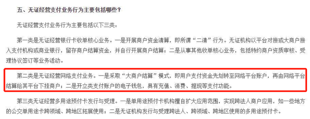 2016年10月人民银行发布的《中国人民银行有关负责人就非银行支付机构风险专项整治工作答记者问》提到,商业平台在没有取得《支付业务许可证》的情况下为消费者和商家提供代收代付服务属于“大商户结算”“二清”模式,是无证经营支付业务行为。