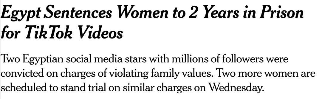 据纽约时报7月28日报道,两位埃及本土的网红被逮捕并被判处两年监禁,这是对自四月以来,抓捕的至少九名TikTok平台上女性网红的首次判决。她们的获罪理由是“违背家庭价值观”(violating family values)。