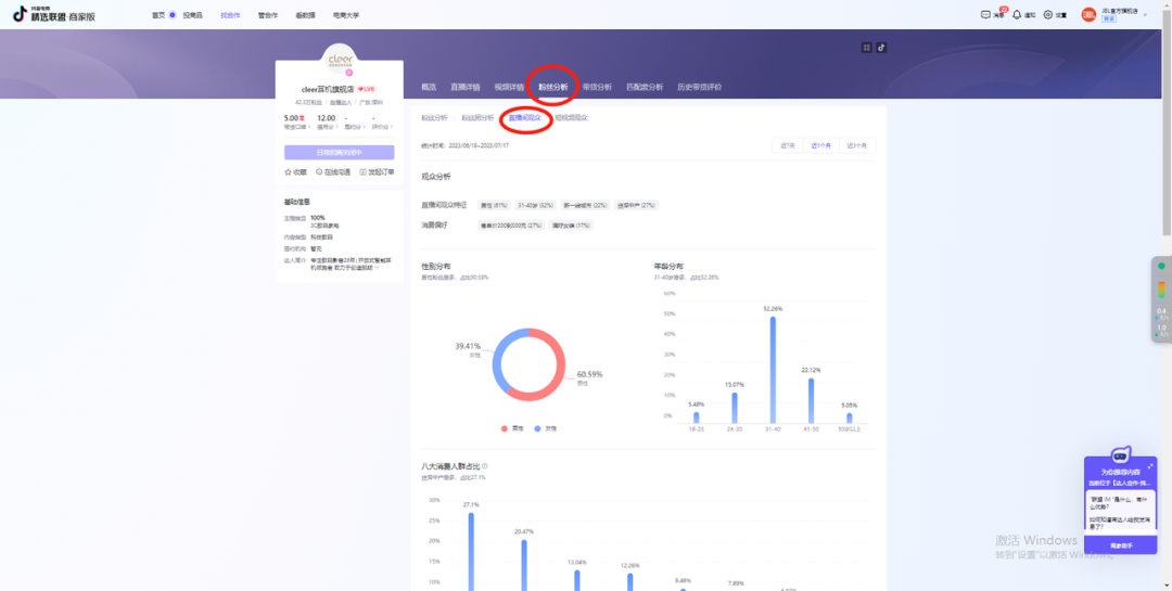 3、在下面的“观众分析”页面中,就是竞争对手近期的直播间观看人群画像;