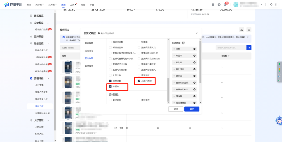 在自定义数据中,勾选“不感兴趣数”和“举报数”;