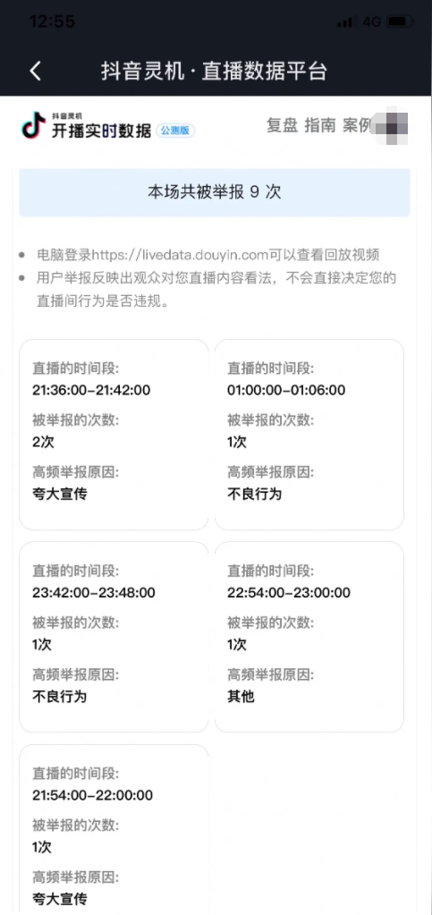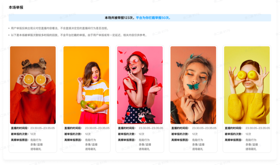 看到被频繁举报的片段,了解观众举报的原因,进而进行内容的调整,提升后续直播的表现。