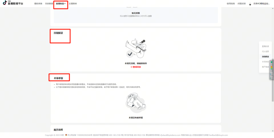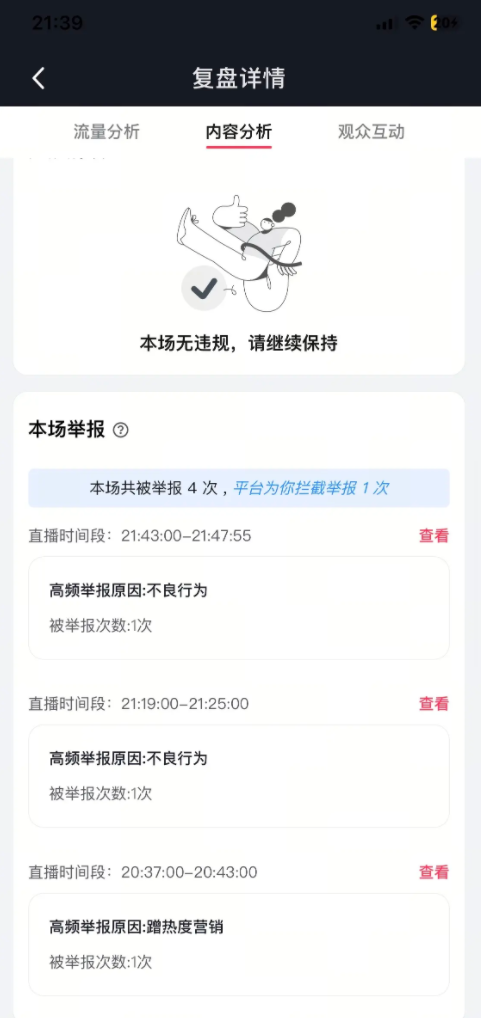 选择“直播复盘”-下滑至“违规解读”和“本场举报”进行查看。
