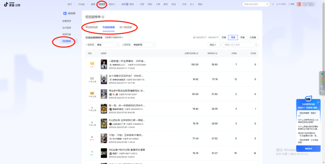 做直播间引流的话,看“直播间视频榜单”;做短视频带货,看“商品视频榜单”;