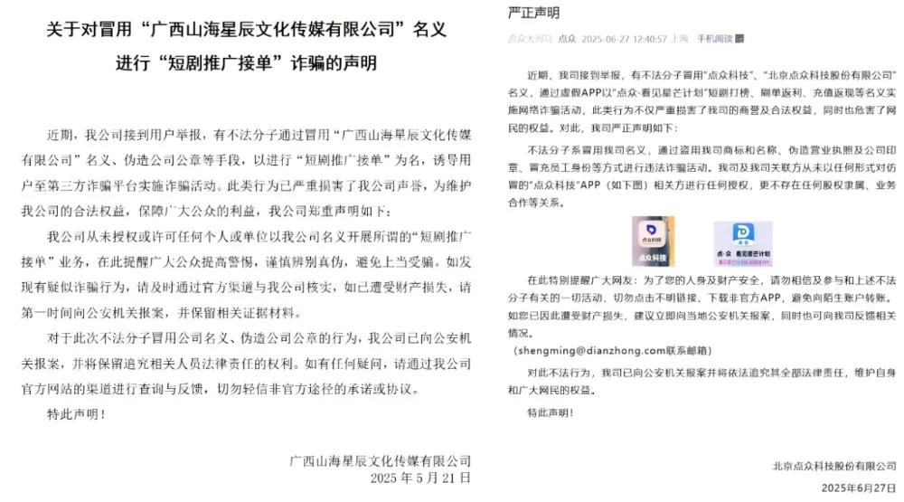 如山海在声明中提到,不法分子冒用其名义,以“短剧推广接单”为名,诱导用户至第三方平台实施诈骗;点众也在声明中称不法分子冒用点众身份,通过虚假APP借“点众·看见星芒计划”短剧打榜、刷单返利、充值返现等名义实施网络诈骗活动。