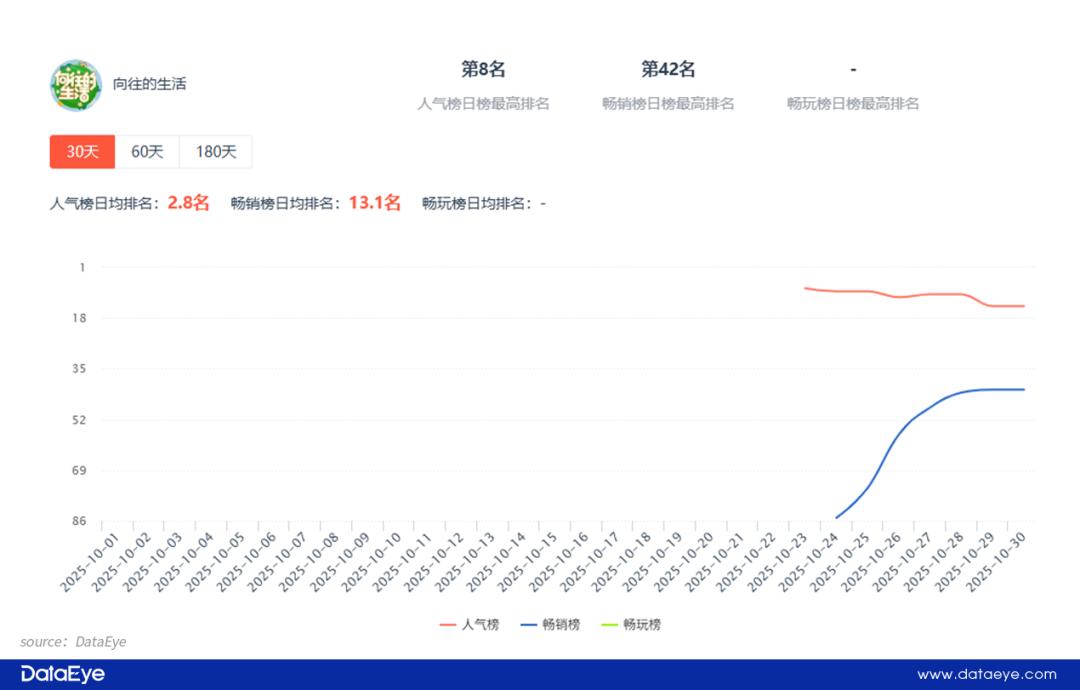 从市场表现来看,《向往的生活》上线热度高,但吸金表现中规中矩。数据显示,《向往的生活》在10月23日首次进入微信小游戏人气榜,并空降至榜单第8名,后续排名表现稳定。