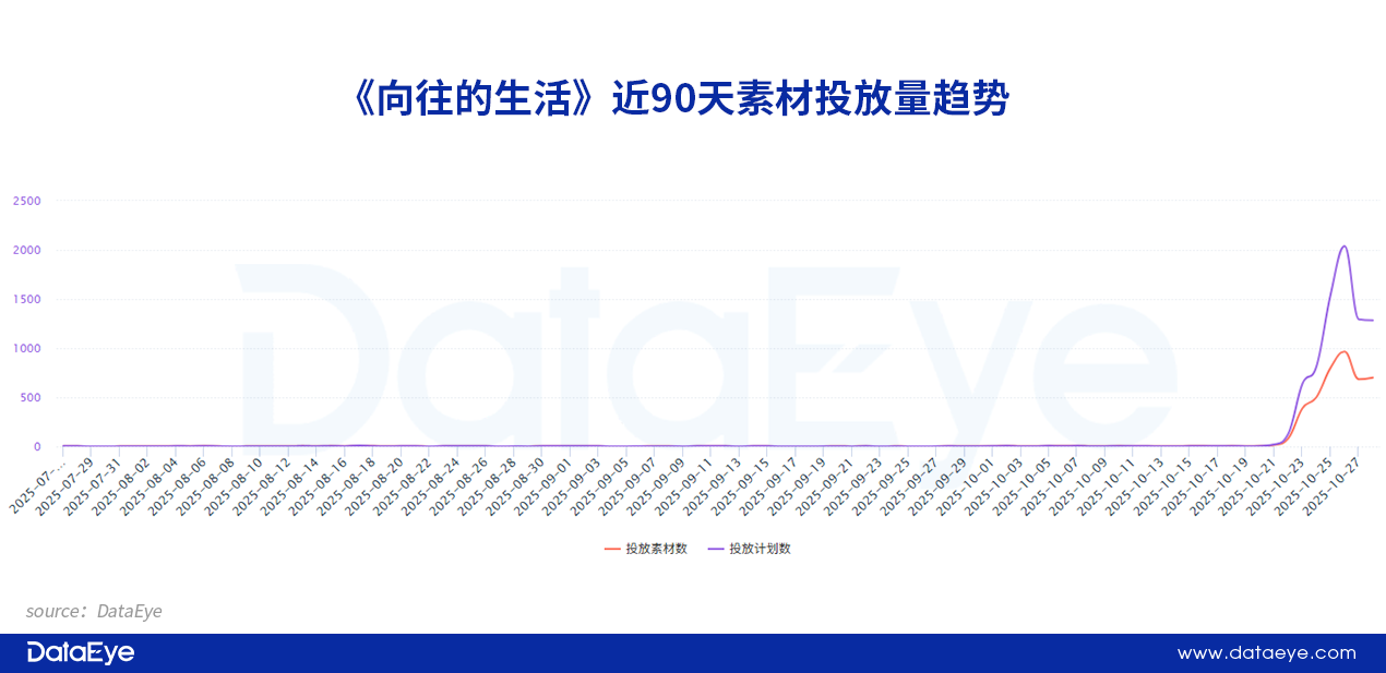 DataEye-ADX投放数据显示,小游戏《向往的生活》在7-10月期间一直保持着较低的素材投放量,但日均投放素材量不超过10条。