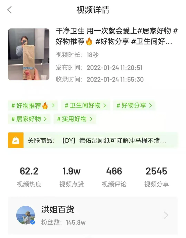 商品主要由种草和母婴育儿号推广,其中播主洪姐百货 在1.24日发布的带货视频,推广效果较好。