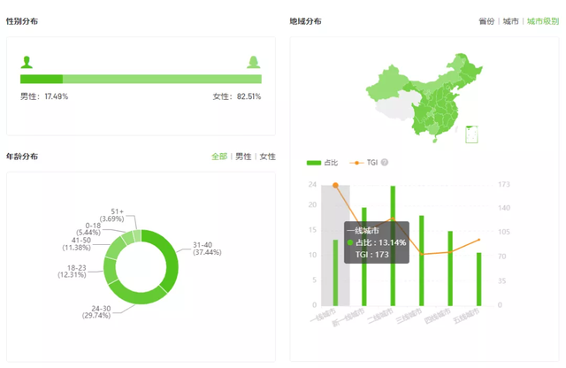 此外,一线城市消费者也表现出强消费意愿,TGI高达173,在推广时可以结合这些特征进行精准投放。